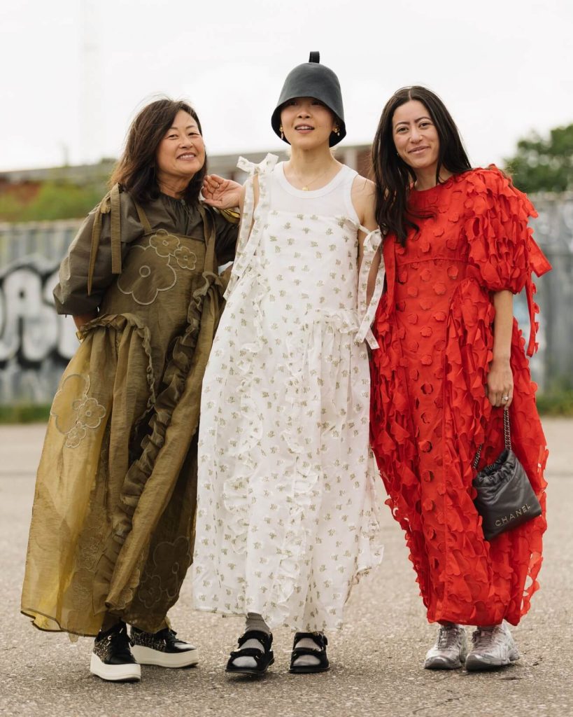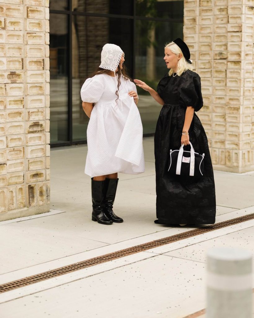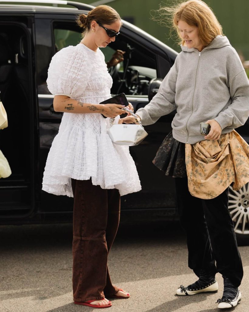 Voluminous dresses floated through the streets, adding a romantic touch to the Copenhagen fashion scene. Billowing sleeves, puff shoulders, and endless ruffles moved gracefully in the wind. Both floor-length gowns and shorter dresses styled with trousers dominated the silhouettes, highlighting a soft yet powerful femininity.