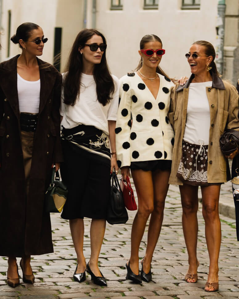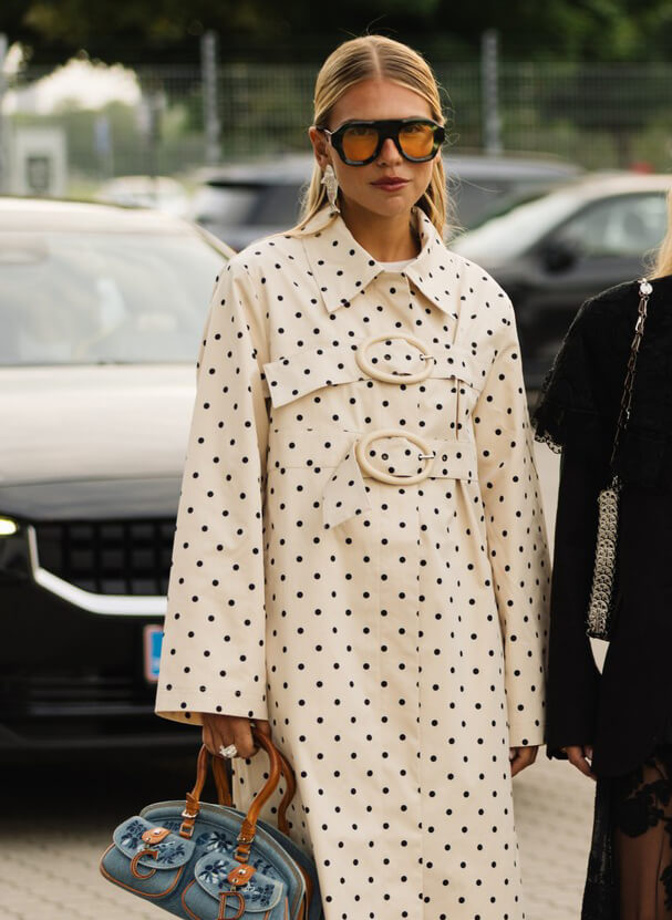 Polka dots were without a doubt the most noticeable street style trend of Copenhagen Fashion Week SS26. From tiny delicate patterns to oversized circles, dots appeared everywhere — often layered in one look. Fashion insiders experimented by mixing polka dots with stripes or accessorizing with bold statement pieces. The color combination of chocolate brown and creamy white stood out as particularly on-trend.